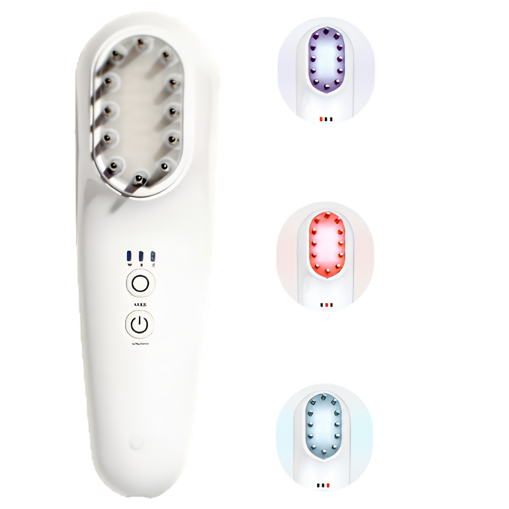 • Thiết bị massage chăm sóc da đầu từ ngoài vào trong với đèn LED 3 bước sóng giúp giảm gàu, ngứa da đầu.