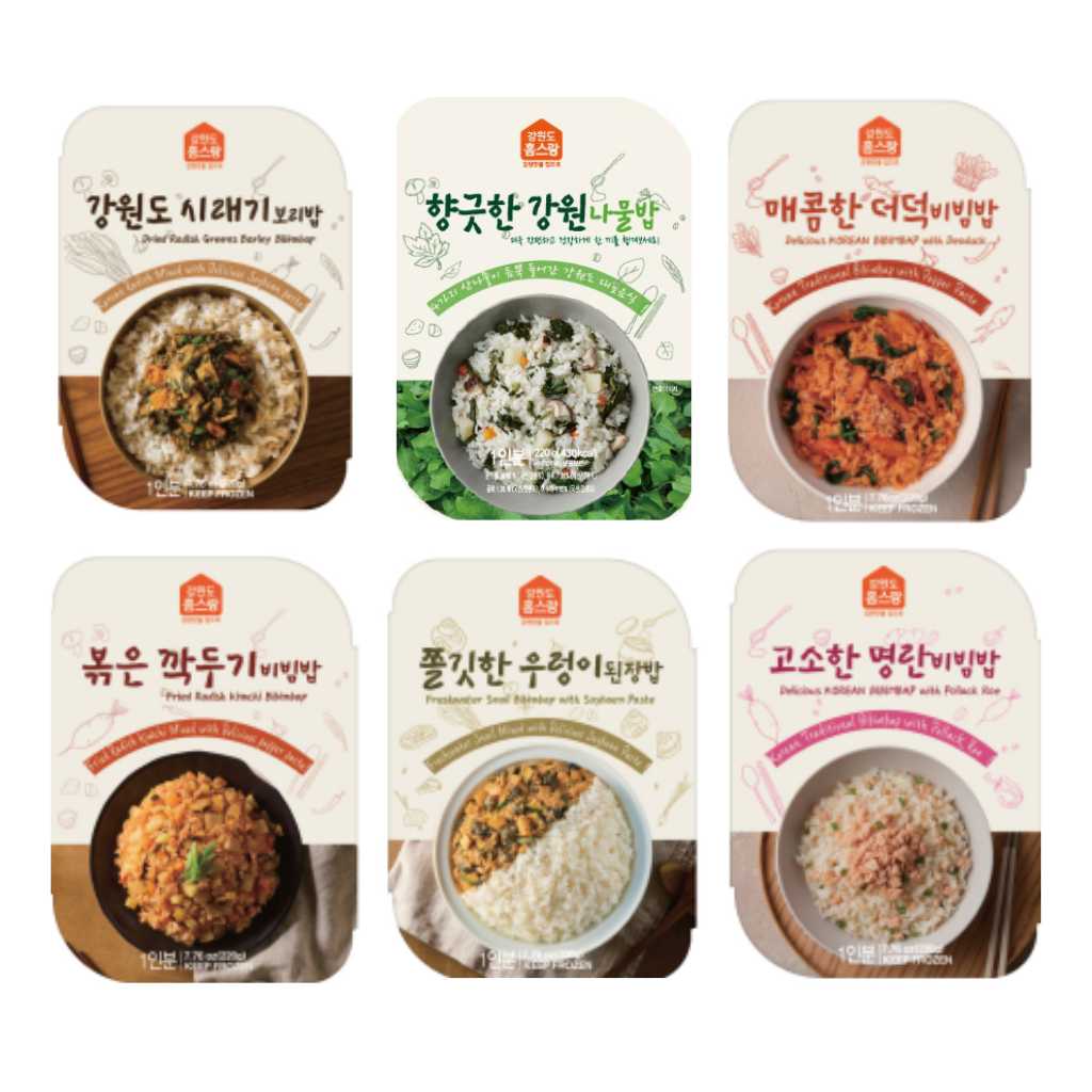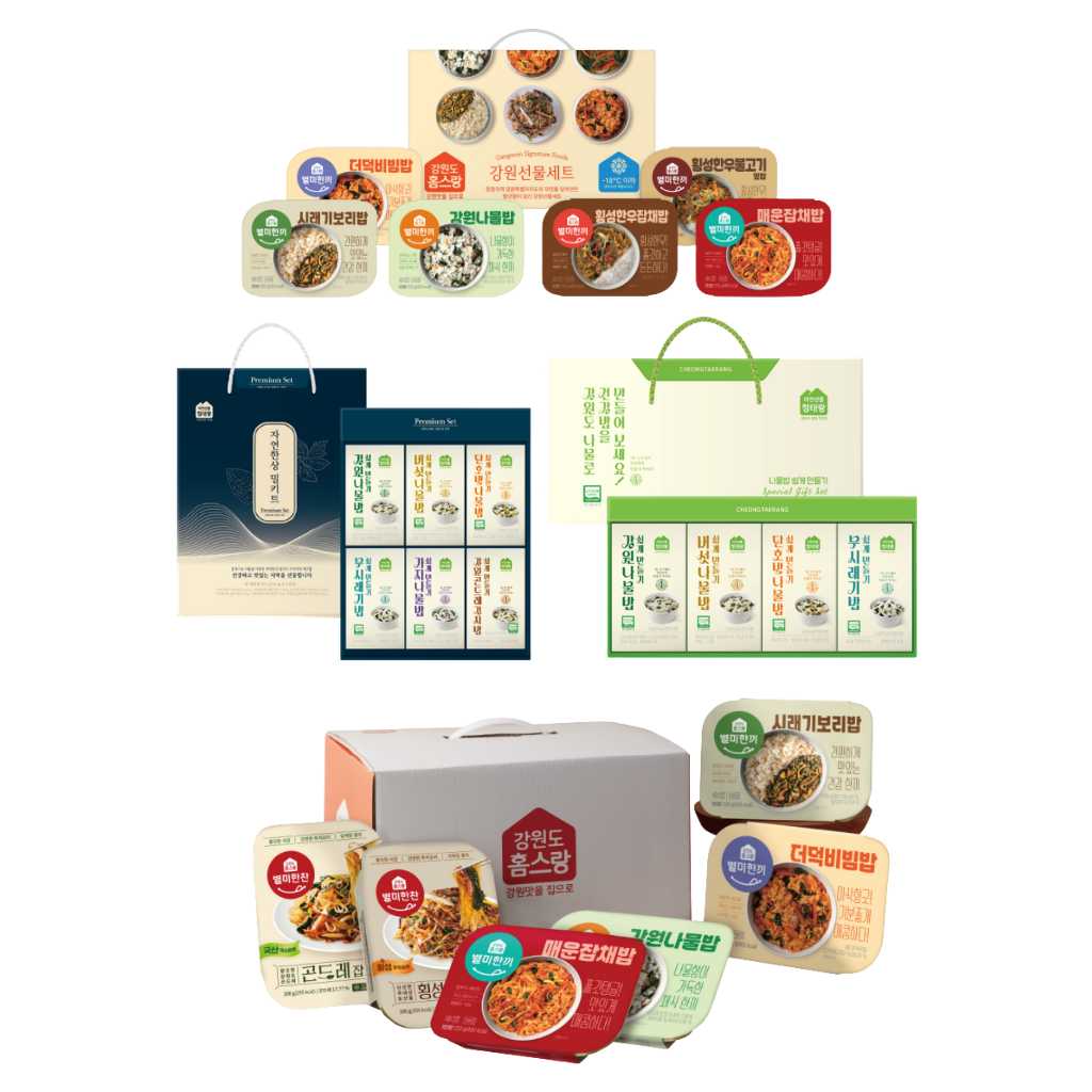 • Bộ quà tặng thực phẩm Gangwon đa dạng của HOMSRANG, bao gồm các bộ bibimbap “dễ nấu” với nhiều hương vị như cơm lúa mạch rau củ, Dakgalbi, kim chi củ cải xào và Bulgogi