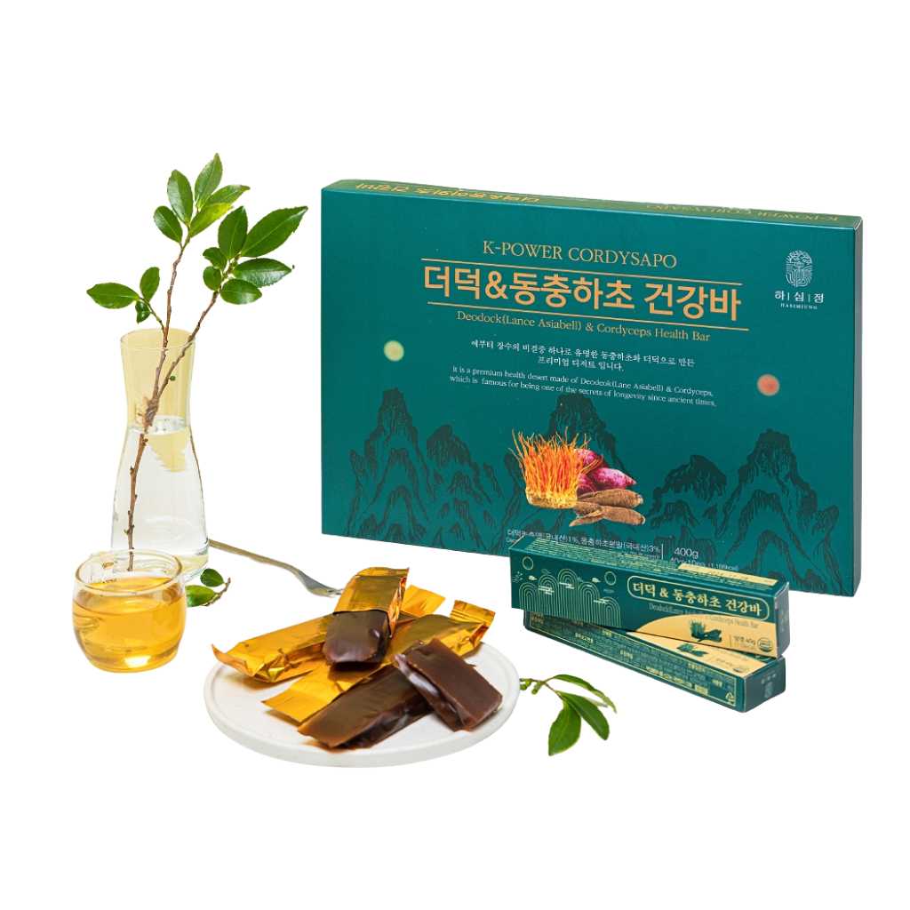 • Thanh ăn nhẹ tốt cho sức khỏe được làm từ sâm Deodeok giàu saponin và đông trùng hạ thảo (Cordycepsmilitaris) là thực phẩm sức khỏe từng được Tần Thủy Hoàng khao khát sự trường sinh ưa chuộng